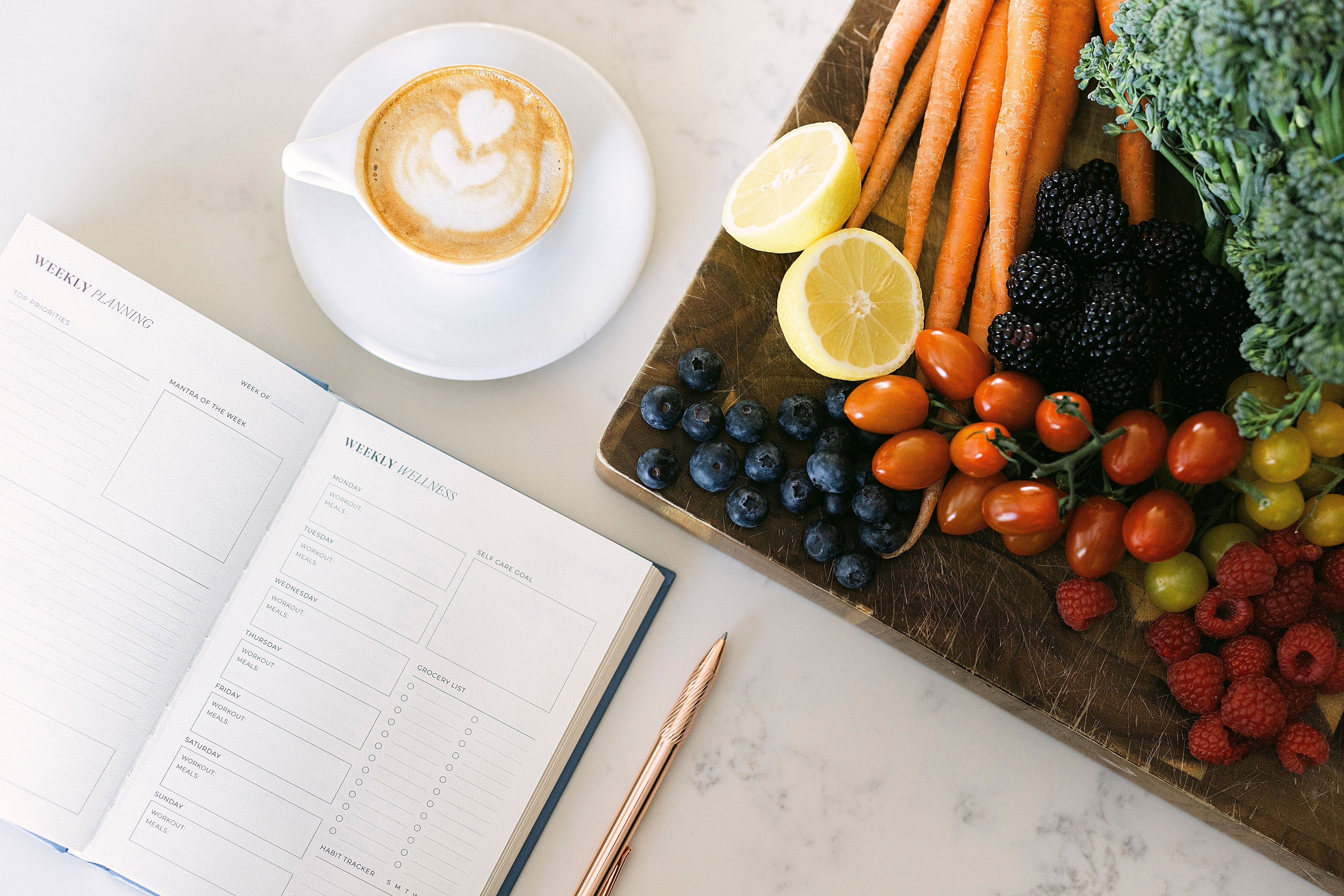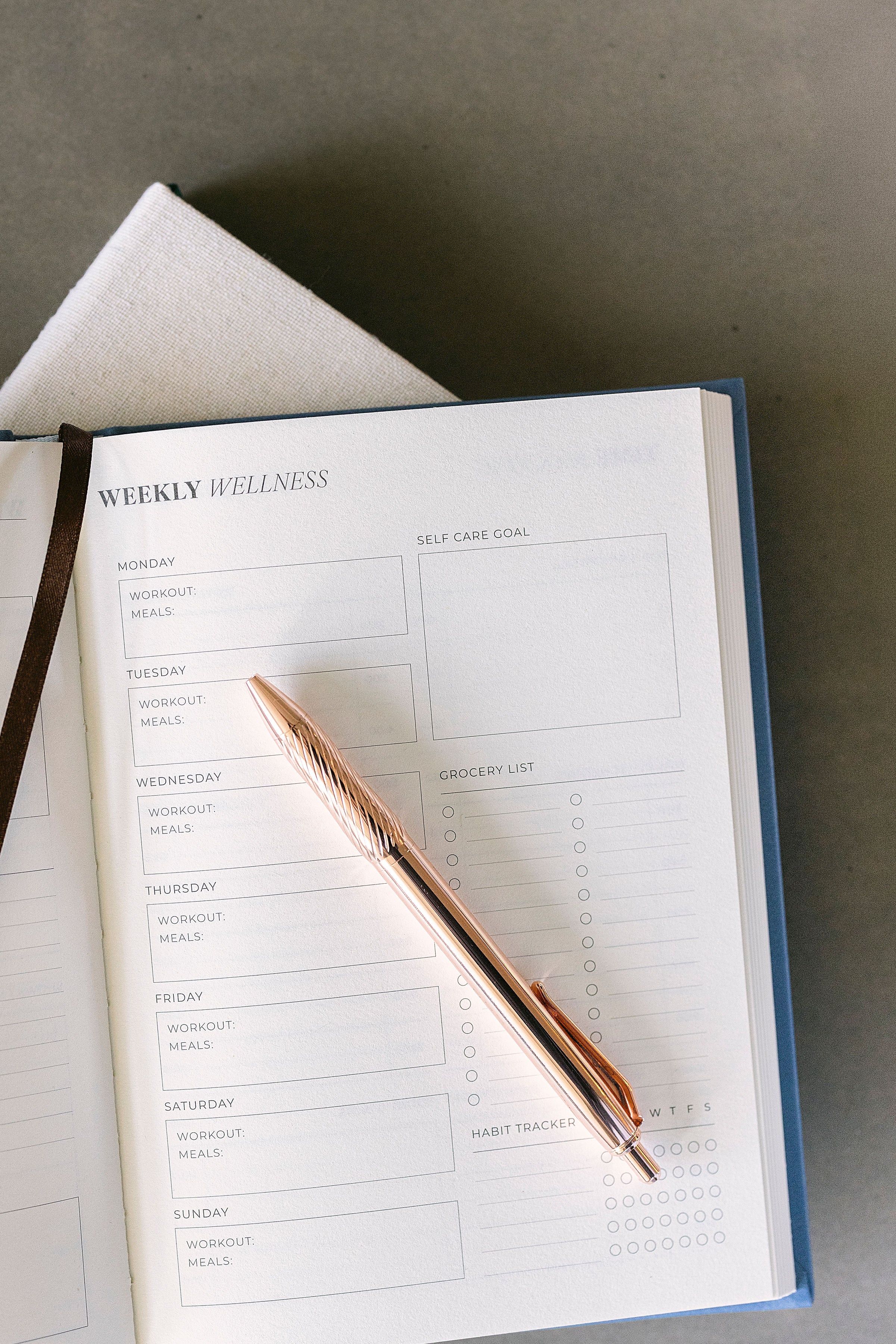 An undated productivity planner with weekly, daily, and wellness layouts, designed to bring structure to your routine without locking you into a start date.